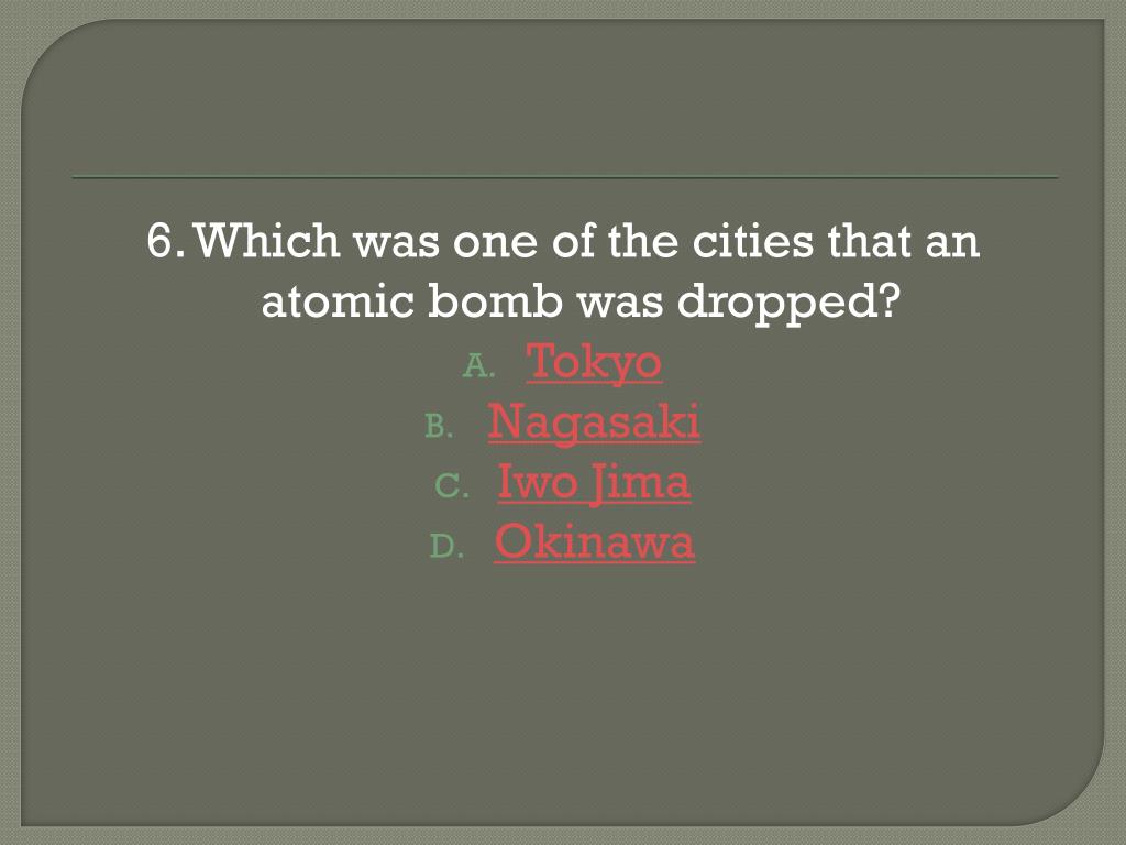 6. Which was one of the cities that an atomic bomb was dropped? Tokyo Nagasaki Iwo Jima Okinawa