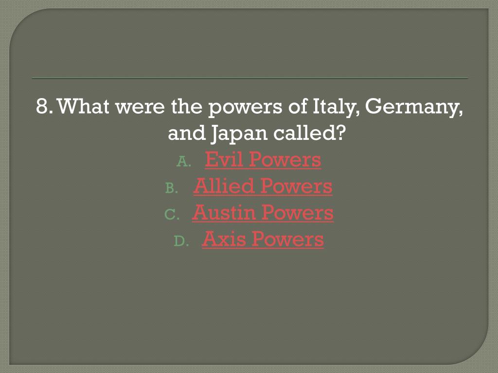 8. What were the powers of Italy, Germany, and Japan called? Evil Powers Allied Powers Austin Powers Axis Powers