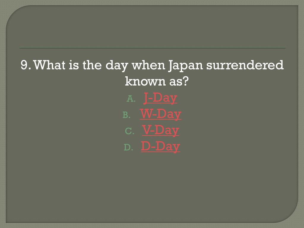 9. What is the day when Japan surrendered known as? J-Day W-Day V-Day D-Day