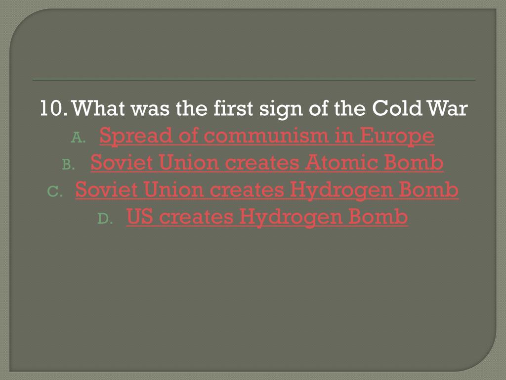 10. What was the first sign of the Cold War Spread of communism in Europe Soviet Union creates Atomic Bomb Soviet Union creates Hydrogen Bomb US creates Hydrogen Bomb