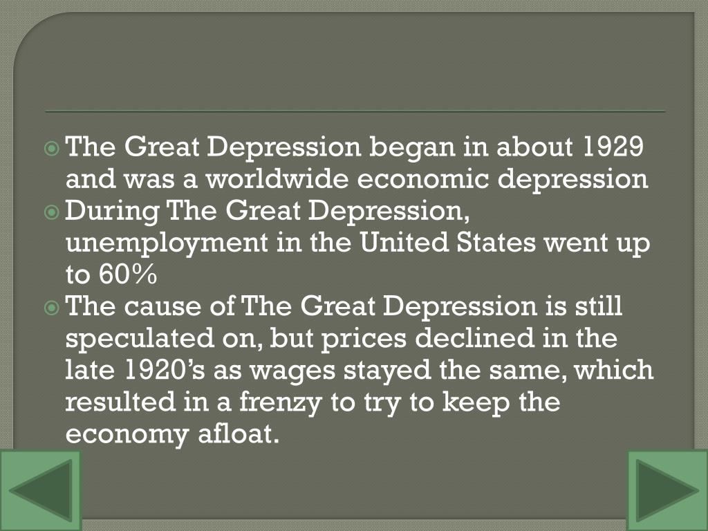 The Great Depression began in about 1929 and was a worldwide economic depression During The Great Depression, unemployment in the United States went up to 60% The cause of The Great Depression is still speculated on, but prices declined in the late 1920’s as wages stayed the same, which resulted in a frenzy to try to keep the economy afloat.