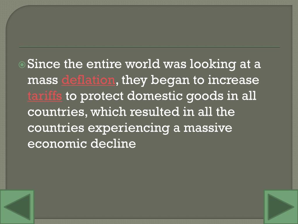 Since the entire world was looking at a mass deflation, they began to increase tariffs to protect domestic goods in all countries, which resulted in all the countries experiencing a massive economic decline