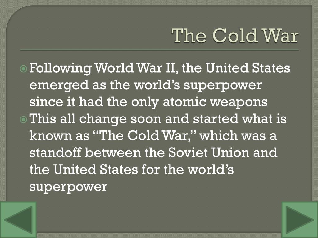 The Cold War Following World War II, the United States emerged as the world’s superpower since it had the only atomic weapons This all change soon and started what is known as “The Cold War,” which was a standoff between the Soviet Union and the United States for the world’s superpower