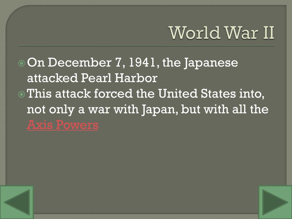 World War II On December 7, 1941, the Japanese attacked Pearl Harbor This attack forced the United States into, not only a war with Japan, but with all the Axis Powers