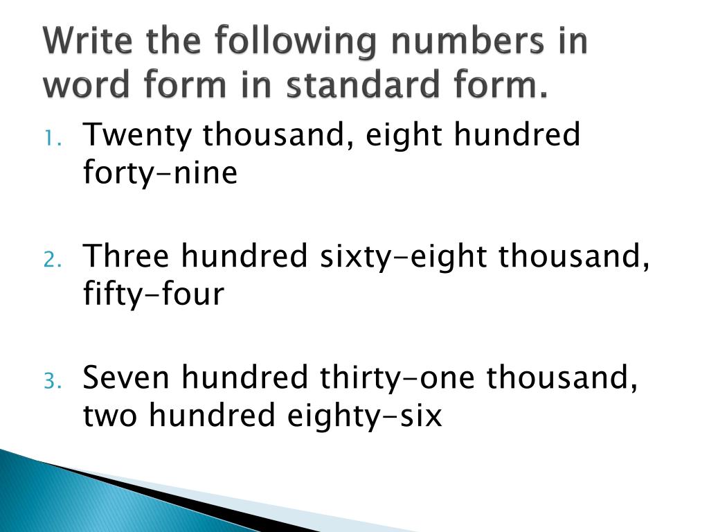 Write the following numbers in word form in standard form. • Twenty thousand, eight hundred forty-nine • Three hundred sixty-eight thousand, fifty-four • Seven hundred thirty-one thousand, two hundred eighty-six