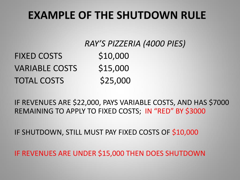 EXAMPLE OF THE SHUTDOWN RULE RAY’S PIZZERIA (4000 PIES) FIXED COSTS $10,000 VARIABLE COSTS $15,000 TOTAL COSTS $25,000 IF REVENUES ARE $22,000, PAYS VARIABLE COSTS, AND HAS $7000 REMAINING TO APPLY TO FIXED COSTS; IN “RED” BY $3000 IF SHUTDOWN, STILL MUST PAY FIXED COSTS OF $10,000 IF REVENUES ARE UNDER $15,000 THEN DOES SHUTDOWN