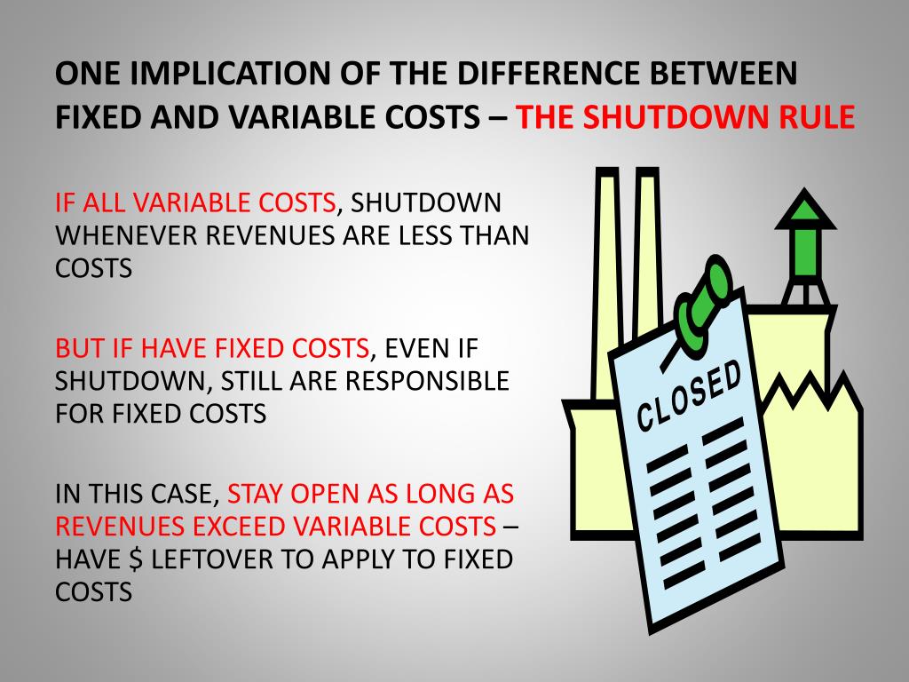 ONE IMPLICATION OF THE DIFFERENCE BETWEEN FIXED AND VARIABLE COSTS – THE SHUTDOWN RULE IF ALL VARIABLE COSTS, SHUTDOWN WHENEVER REVENUES ARE LESS THAN COSTS BUT IF HAVE FIXED COSTS, EVEN IF SHUTDOWN, STILL ARE RESPONSIBLE FOR FIXED COSTS IN THIS CASE, STAY OPEN AS LONG AS REVENUES EXCEED VARIABLE COSTS – HAVE $ LEFTOVER TO APPLY TO FIXED COSTS