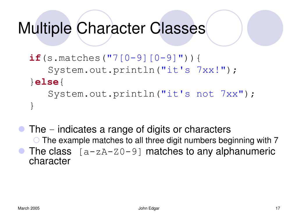 Multiple Character Classes if(s.matches("7[0-9][0-9]")){ System.out.println("it's 7xx!"); }else{ System.out.println("it's not 7xx"); } • The – indicates a range of digits or characters • The example matches to all three digit numbers beginning with 7 • The class [a-zA-Z0-9] matches to any alphanumeric character John Edgar