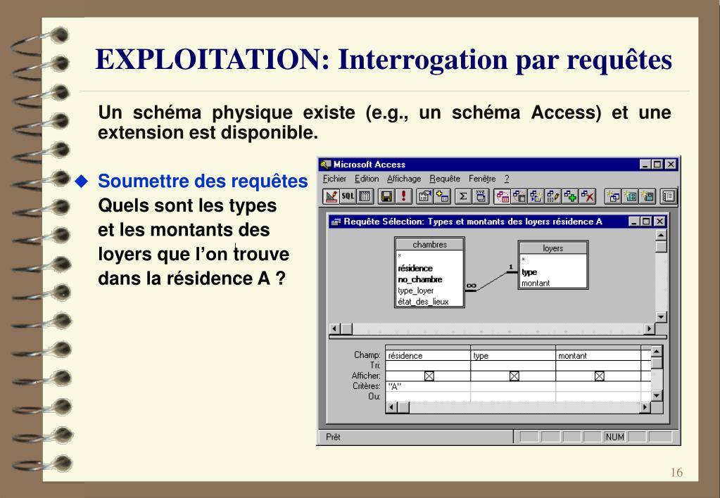 EXPLOITATION: Interrogation par requêtes Un schéma physique existe (e.g., un schéma Access) et une extension est disponible. • Soumettre des requêtes Quels sont les types et les montants des loyersque l’on trouve dans la résidence A ?