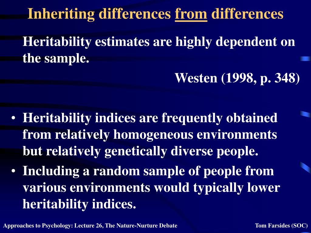 Inheriting differences from differences Heritability estimates are highly dependent on the sample. Westen (1998, p. 348) • Heritability indices are frequently obtained from relatively homogeneous environments but relatively genetically diverse people. • Including a random sample of people from various environments would typically lower heritability indices. Approaches to Psychology: Lecture 26, The Nature-Nurture Debate