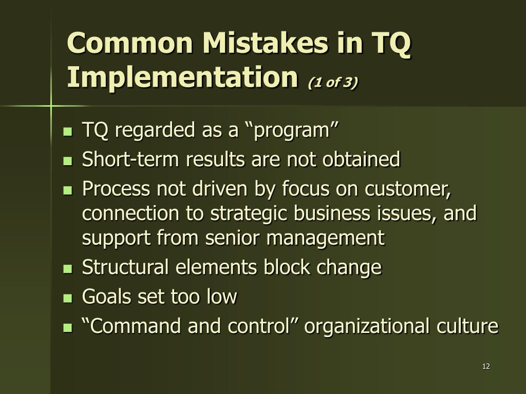 Common Mistakes in TQ Implementation (1 of 3) • TQ regarded as a “program” • Short-term results are not obtained • Process not driven by focus on customer, connection to strategic business issues, and support from senior management • Structural elements block change • Goals set too low • “Command and control” organizational culture