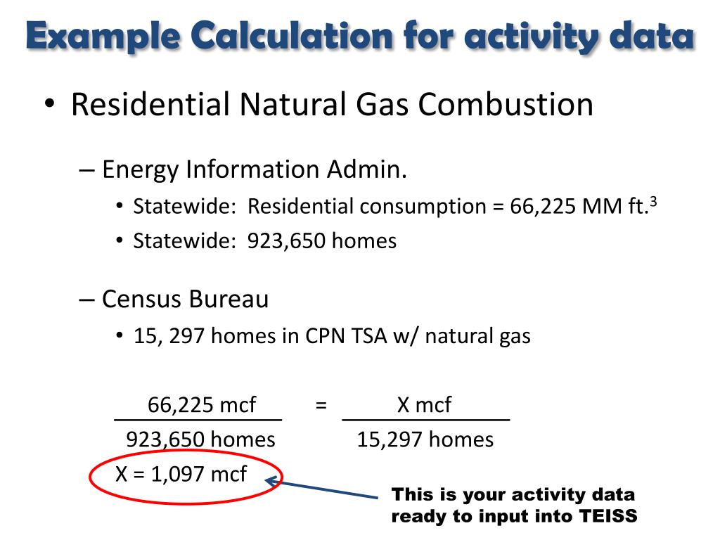 Example Calculation for activity data • Residential Natural Gas Combustion • Energy Information Admin. • Statewide: Residential consumption = 66,225 MM ft.3 • Statewide: 923,650 homes • Census Bureau • 15, 297 homes in CPN TSA w/ natural gas 66,225 mcf = X mcf 923,650 homes 15,297 homes X = 1,097 mcf This is your activity data ready to input into TEISS