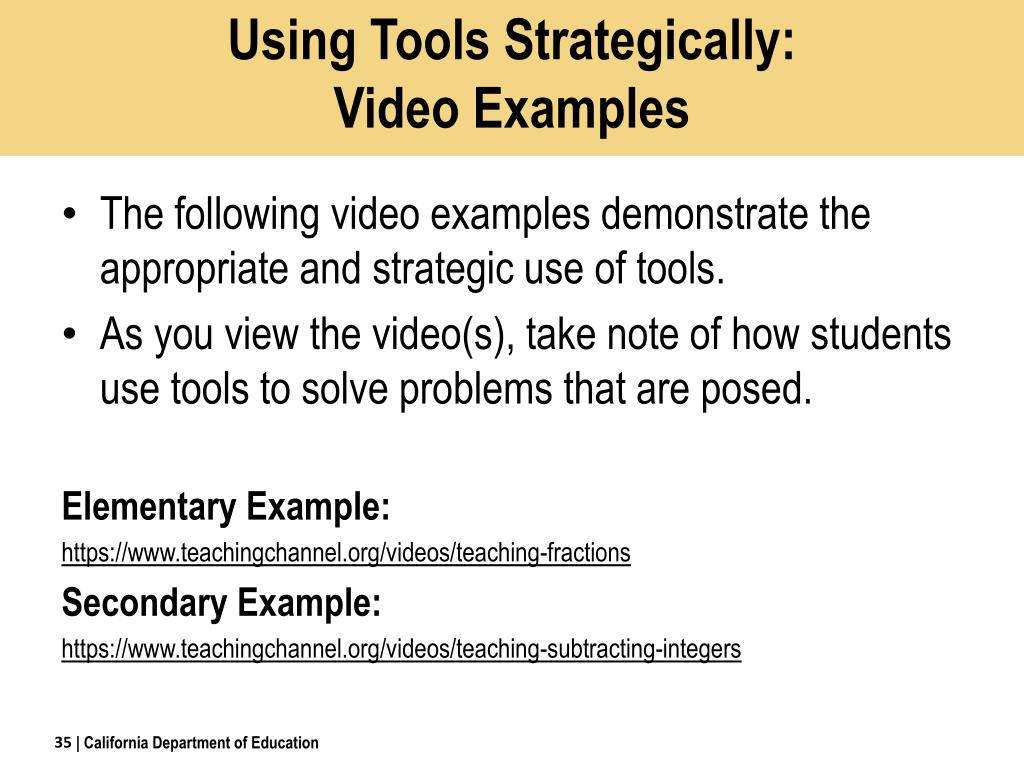 Using Tools Strategically: Video Examples | California Department of Education The following video examples demonstrate the appropriate and strategic use of tools. As you view the video(s), take note of how students use tools to solve problems that are posed. Elementary Example: https://www.teachingchannel.org/videos/teaching-fractions Secondary Example: https://www.teachingchannel.org/videos/teaching-subtracting-integers