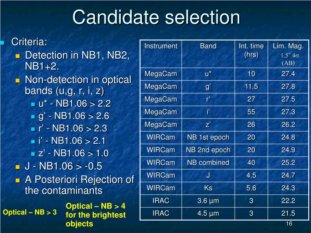 Candidate selection • Criteria: • Detection in NB1, NB2, NB1+2. • Non-detection in optical bands (u,g, r, i, z) • u* - NB1.06 > 2.2 • g’ - NB1.06 > 2.6 • r’ - NB1.06 > 2.3 • i’ - NB1.06 > 2.1 • z’ - NB1.06 > 1.0 • J - NB1.06 > -0.5 • A Posteriori Rejection of the contaminants Optical – NB > 4 for the brightest objects Optical – NB > 3