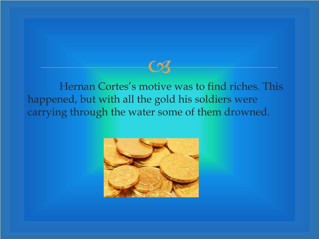 Hernan Cortes’s motive was to find riches. This happened, but with all the gold his soldiers were carrying through the water some of them drowned.