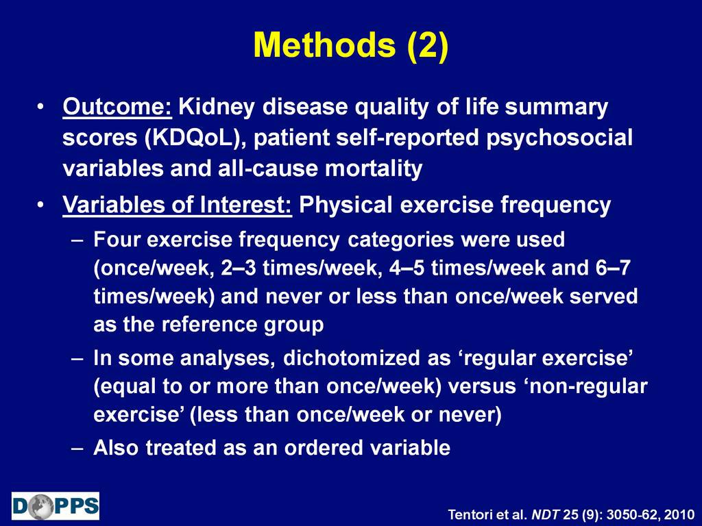 This study explores the correlation between physical exercise and outcomes in DOPPS participants. It analyzes exercise frequency, facility offerings, participant characteristics, quality of life, psychosocial variables, and mortality rates. Various tables and figures illustrate the associations found.