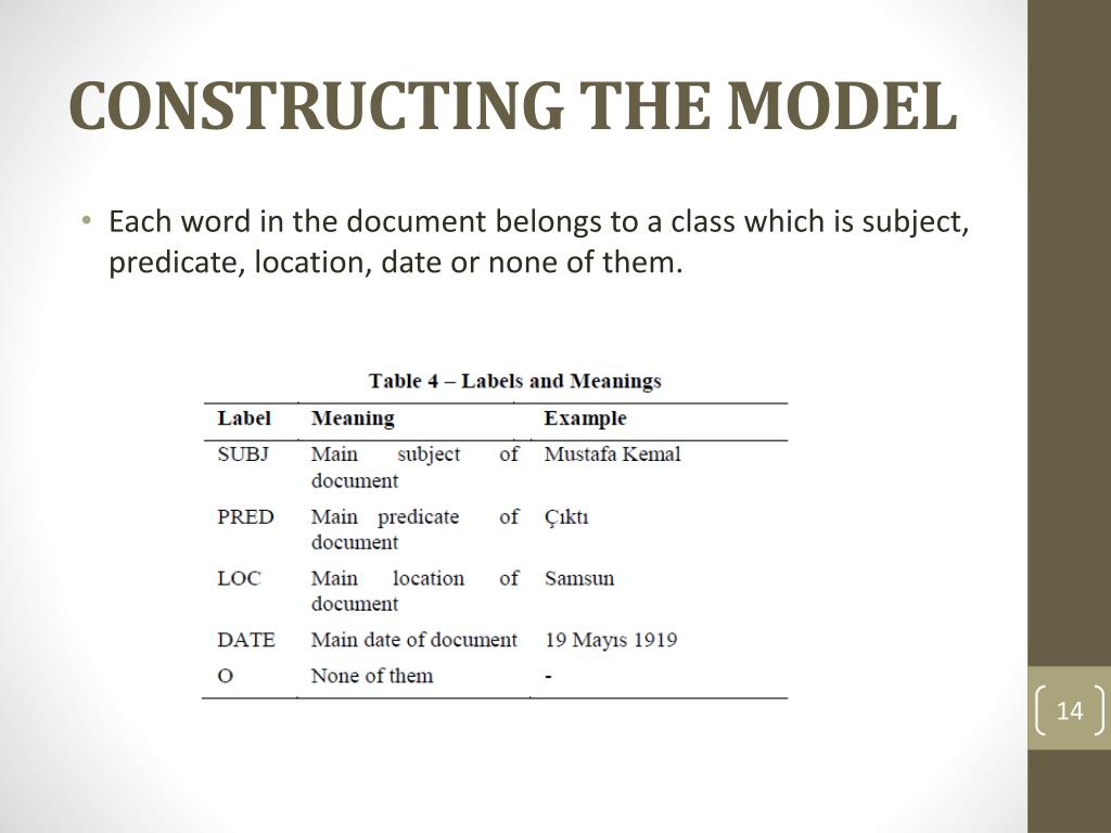 CONSTRUCTING THE MODEL • Each word in the document belongs to a class which is subject, predicate, location, date or none of them.