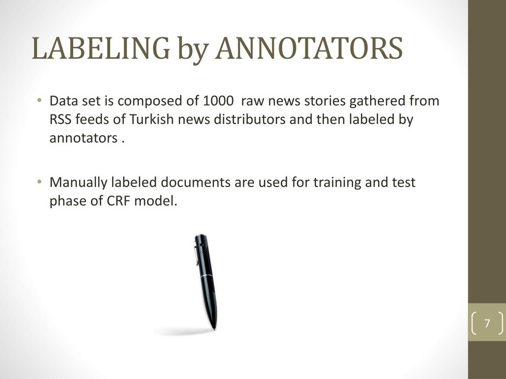 LABELING by ANNOTATORS • Data set is composed of 1000 raw news stories gathered from RSS feeds of Turkish news distributors and then labeled by annotators. • Manually labeled documents are used for training and test phase of CRF model.