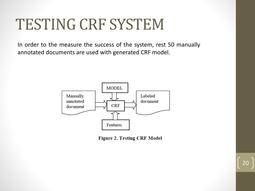 TESTING CRF SYSTEM In order to the measure the success of the system, rest 50 manually annotated documents are used with generated CRF model.