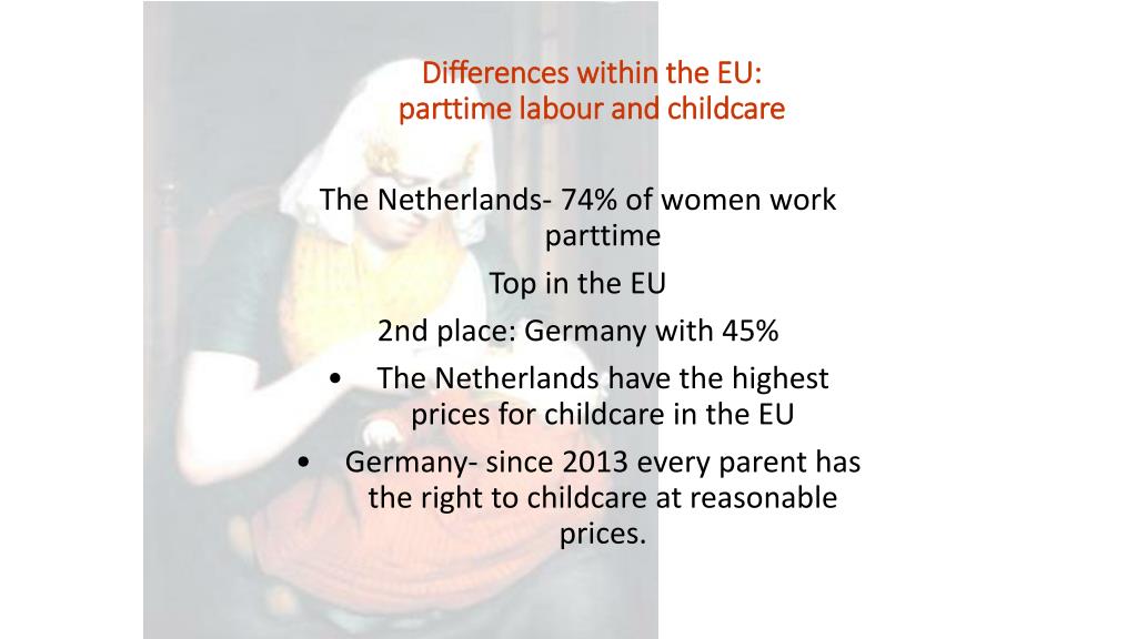 Differences within the EU:parttime labour and childcare The Netherlands- 74% of women work parttime Top in the EU 2nd place: Germany with 45% The Netherlands have the highest prices for childcare in the EU Germany- since 2013 every parent has the right to childcare at reasonable prices.