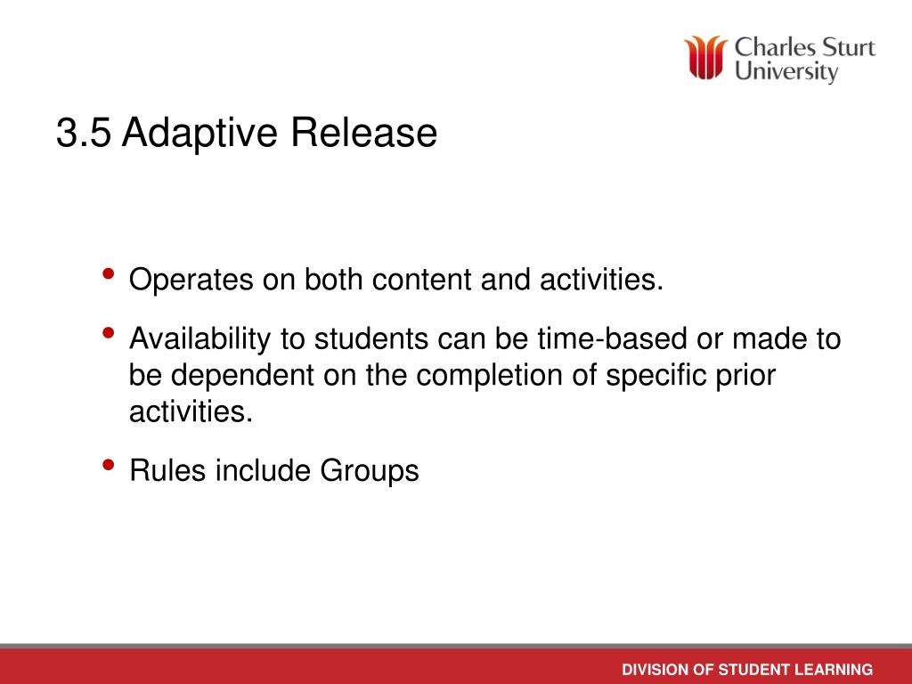 3.5 Adaptive Release • Operates on both content and activities. • Availability to students can be time-based or made to be dependent on the completion of specific prior activities. • Rules include Groups