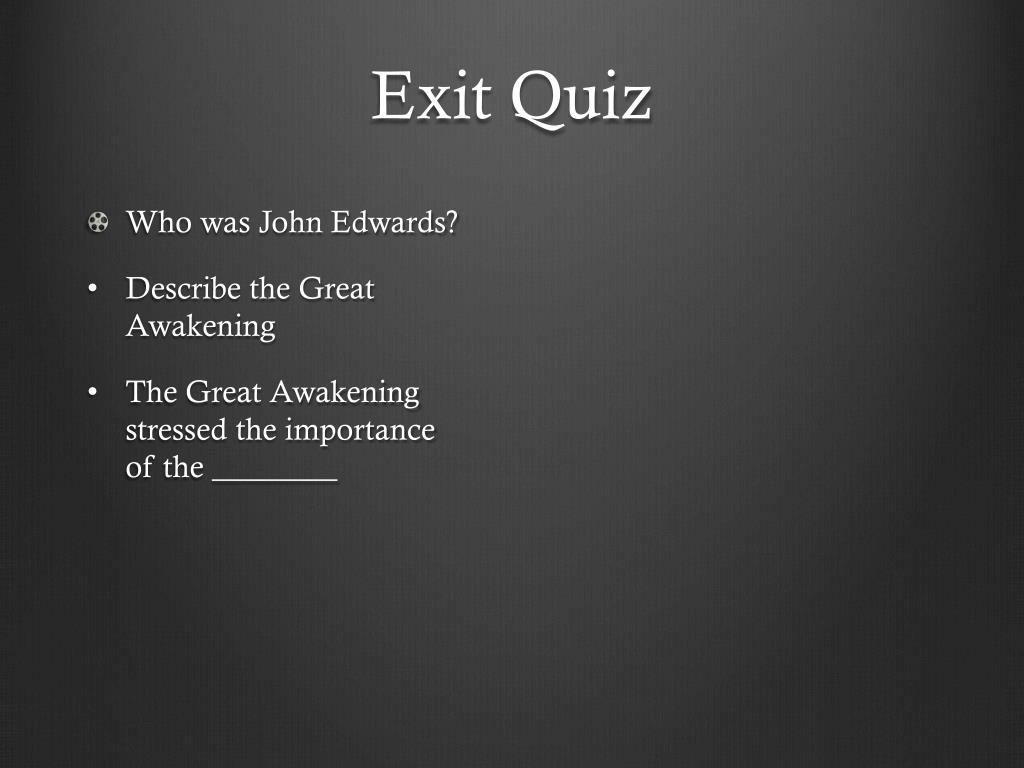 Exit Quiz • Who was John Edwards? • Describe the Great Awakening • The Great Awakening stressed the importance of the ________