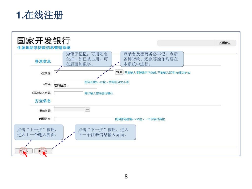 1.在线注册 为便于记忆,可用姓名全拼,如已被占用,可在后面加数字。 登录名及密码务必牢记,今后各种贷款、还款等操作均要在本系统中进行。 点击“上一步”按钮,进入上一个输入界面。 点击“下一步”按钮,进入下一个注册信息输入界面。 8