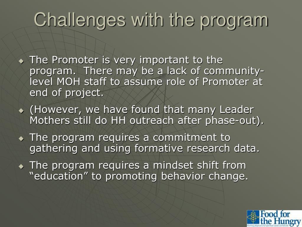 Challenges with the program • The Promoter is very important to the program. There may be a lack of community-level MOH staff to assume role of Promoter at end of project. • (However, we have found that many Leader Mothers still do HH outreach after phase-out). • The program requires a commitment to gathering and using formative research data. • The program requires a mindset shift from “education” to promoting behavior change.