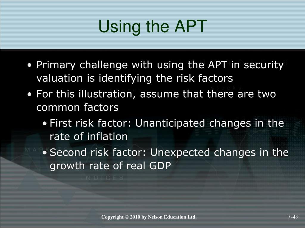 Using the APT • Primary challenge with using the APT in security valuation is identifying the risk factors • For this illustration, assume that there are two common factors • First risk factor: Unanticipated changes in the rate of inflation • Second risk factor: Unexpected changes in the growth rate of real GDP