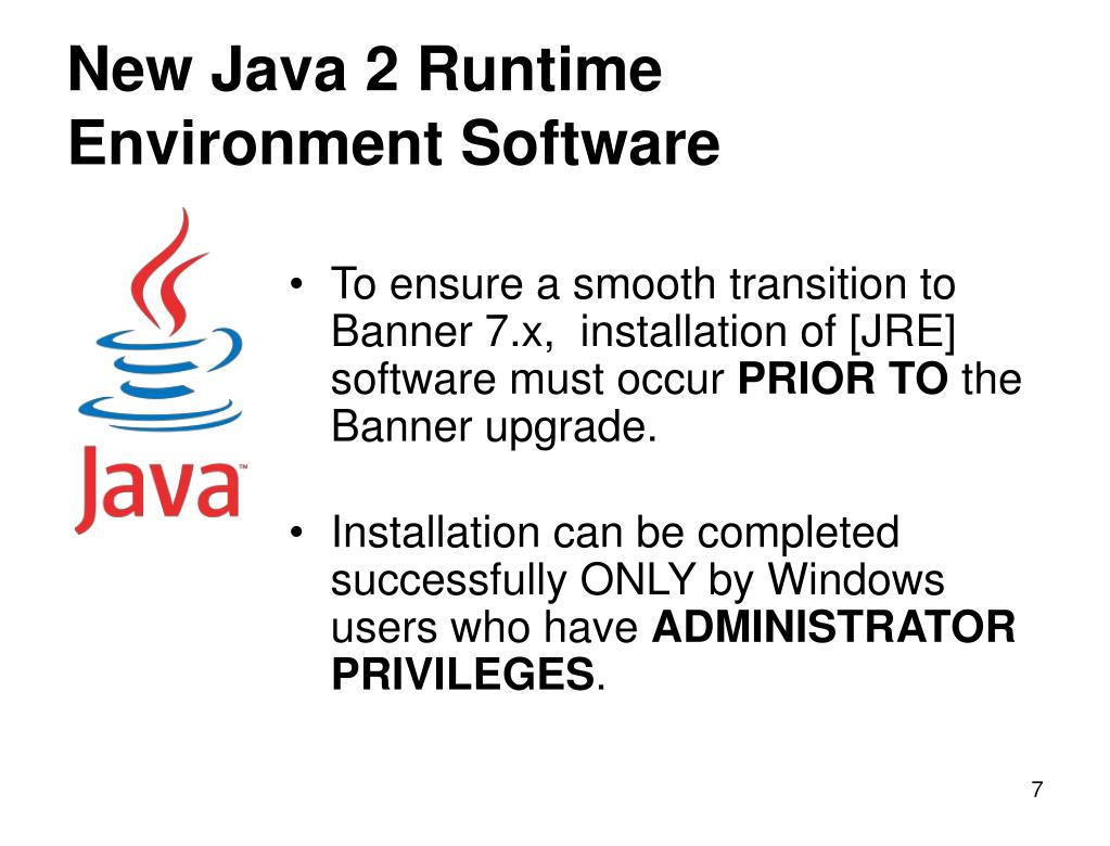 New Java 2 Runtime Environment Software • To ensure a smooth transition to Banner 7.x, installation of [JRE] software must occur PRIOR TO the Banner upgrade. • Installation can be completed successfully ONLY by Windows users who have ADMINISTRATOR PRIVILEGES.