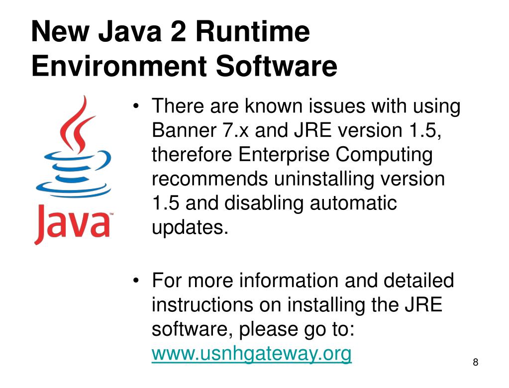 New Java 2 Runtime Environment Software • There are known issues with using Banner 7.x and JRE version 1.5, therefore Enterprise Computing recommends uninstalling version 1.5 and disabling automatic updates. • For more information and detailed instructions on installing the JRE software, please go to: www.usnhgateway.org
