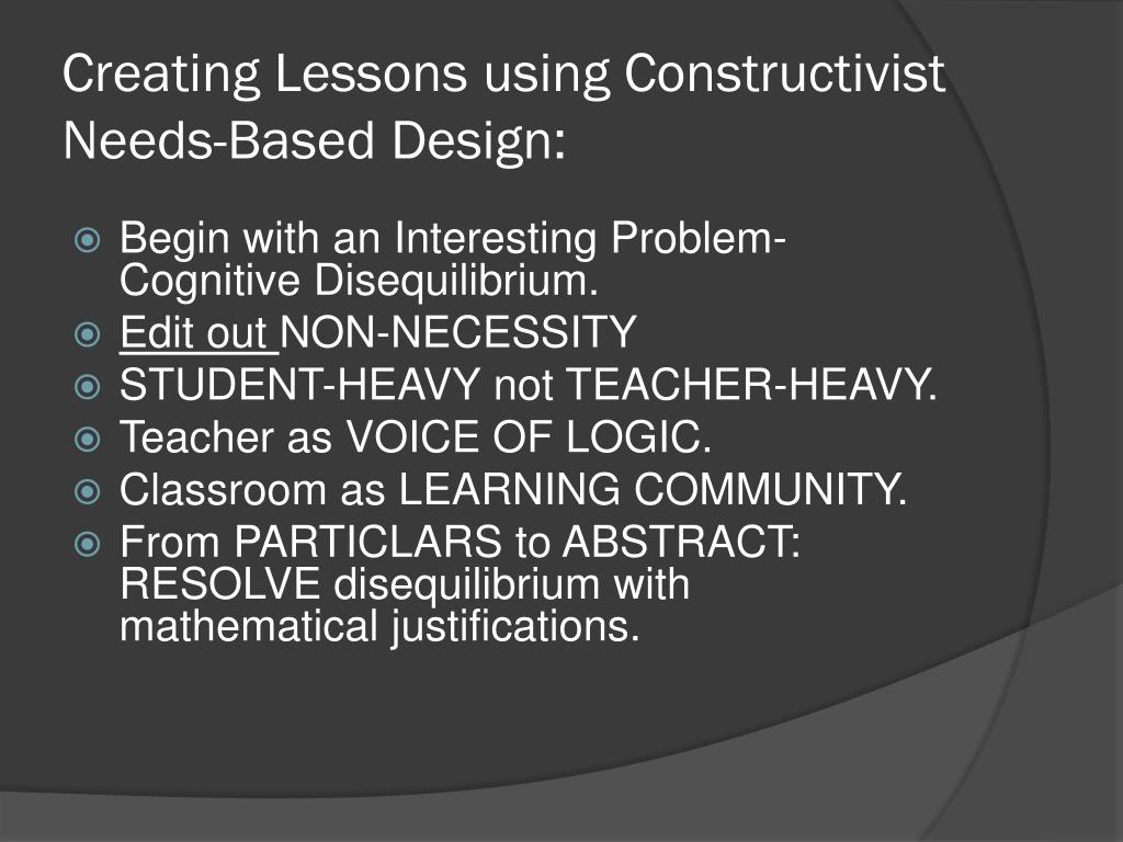 Creating Lessons using Constructivist Needs-Based Design: • Begin with an Interesting Problem-Cognitive Disequilibrium. • Edit out NON-NECESSITY • STUDENT-HEAVY not TEACHER-HEAVY. • Teacher as VOICE OF LOGIC. • Classroom as LEARNING COMMUNITY. • From PARTICLARS to ABSTRACT: RESOLVE disequilibrium with mathematical justifications.