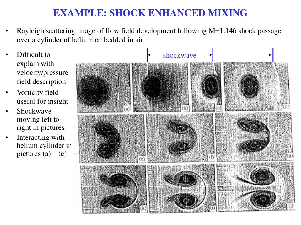 EXAMPLE: SHOCK ENHANCED MIXING • Rayleigh scattering image of flow field development following M=1.146 shock passage over a cylinder of helium embedded in air • Difficult to explain with velocity/pressure field description • Vorticity field useful for insight • Shockwave moving left to right in pictures • Interacting with helium cylinder in pictures (a) – (c) shockwave