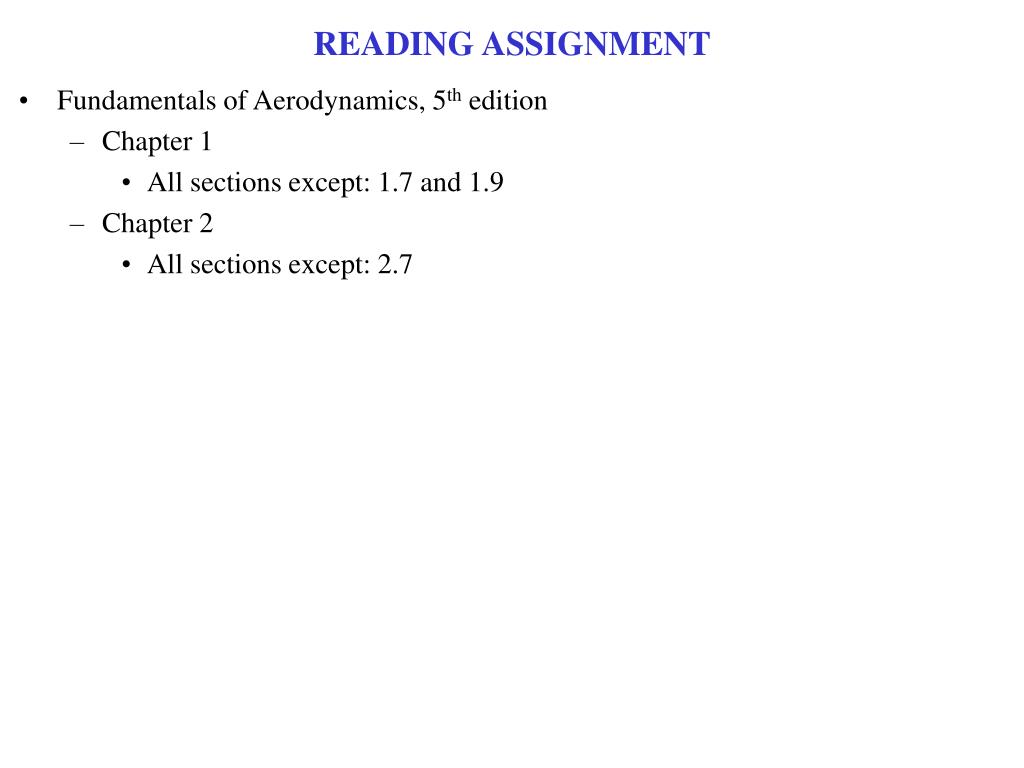 READING ASSIGNMENT • Fundamentals of Aerodynamics, 5th edition • Chapter 1 • All sections except: 1.7 and 1.9 • Chapter 2 • All sections except: 2.7