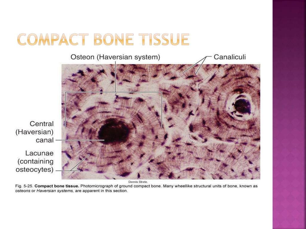 Specialized CONNECTIVE TISSUE:BONE TISSUE (cont.) • Compact bone • Osteon (Haversian system) • Structural unity of bone • Spaces for osteocytes called lacunae • Matrix present in concentric rings called lamellae • Canaliculi are canals that join lacunae with the central Haversiancanal (communication passageway) • Cell types • Osteocyte: mature, inactive bone cell • Osteoblast: active bone-forming cell • Osteoclast: bone-destroying cell