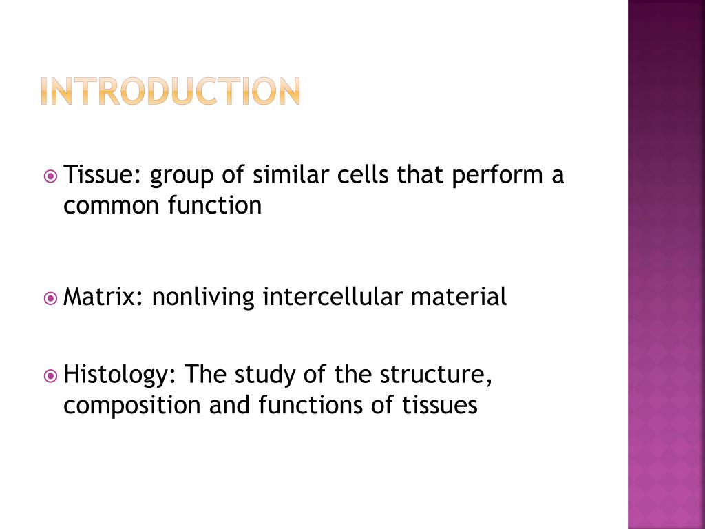 INTRODUCTION • Tissue: group of similar cells that perform a common function • Matrix: nonliving intercellular material • Histology: The study of the structure, composition and functions of tissues