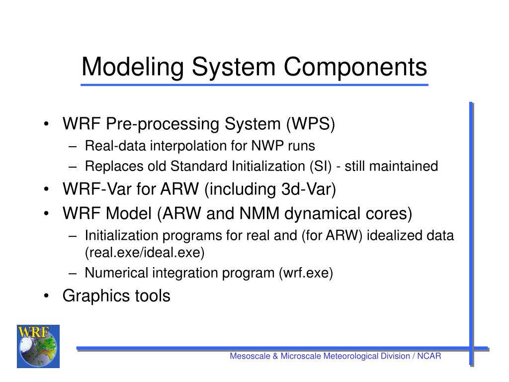 Modeling System Components • WRF Pre-processing System (WPS) • Real-data interpolation for NWP runs • Replaces old Standard Initialization (SI) - still maintained • WRF-Var for ARW (including 3d-Var) • WRF Model (ARW and NMM dynamical cores) • Initialization programs for real and (for ARW) idealized data (real.exe/ideal.exe) • Numerical integration program (wrf.exe) • Graphics tools