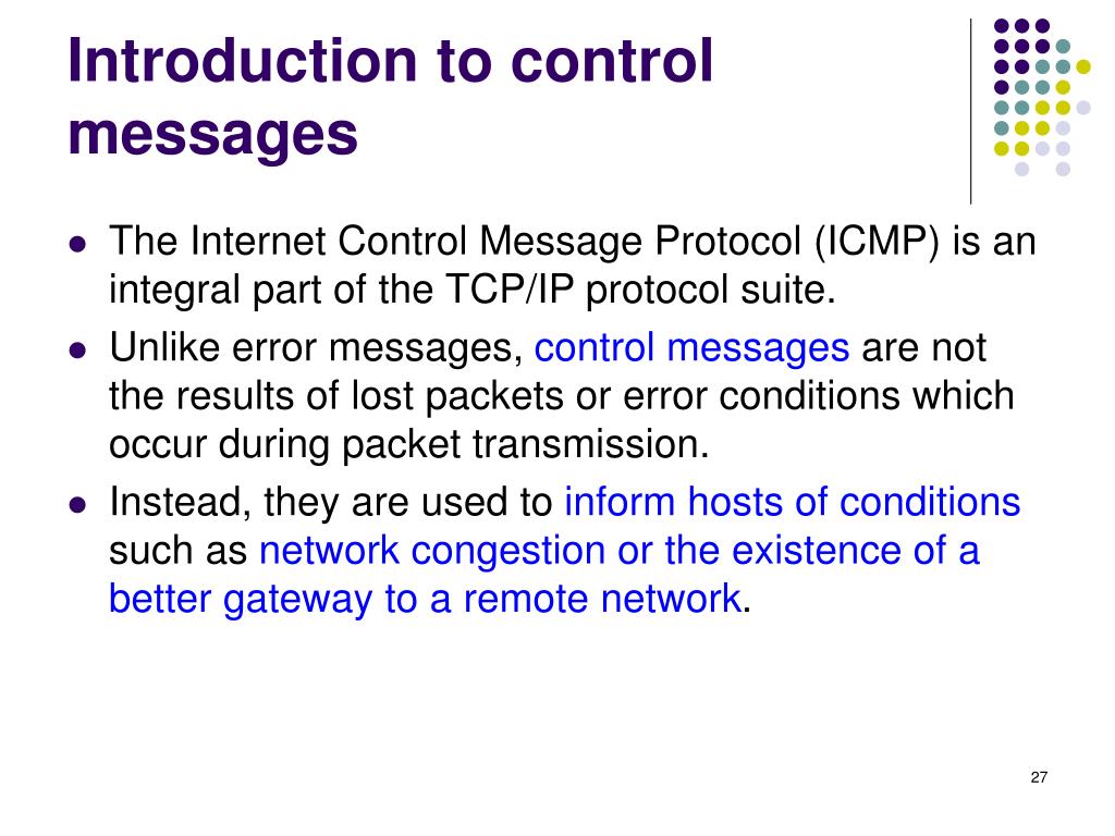 Introduction to control messages • The Internet Control Message Protocol (ICMP) is an integral part of the TCP/IP protocol suite. • Unlike error messages, control messages are not the results of lost packets or error conditions which occur during packet transmission. • Instead, they are used to inform hosts of conditions such as network congestion or the existence of a better gateway to a remote network.