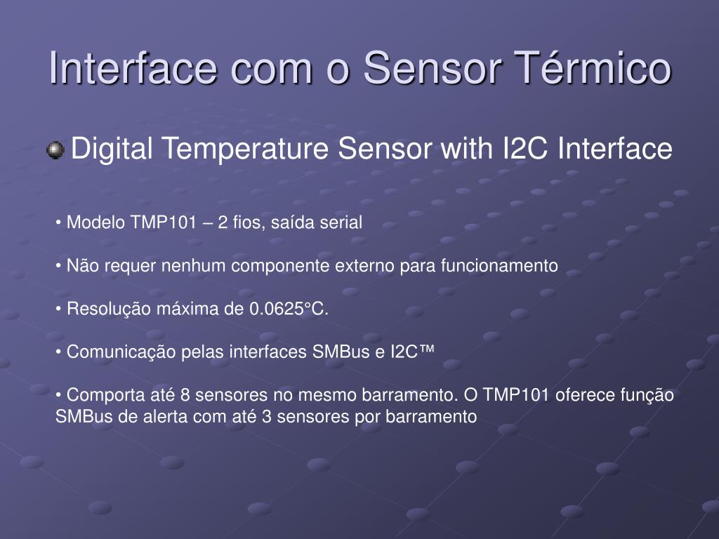 Interface com o Sensor Térmico • Digital Temperature Sensorwith I2C Interface • Modelo TMP101 – 2 fios, saída serial • Não requer nenhum componente externo para funcionamento • Resolução máxima de 0.0625°C. • Comunicação pelas interfaces SMBus e I2C™ • Comporta até 8 sensores no mesmo barramento. O TMP101 oferece função • SMBus de alerta com até 3 sensores por barramento