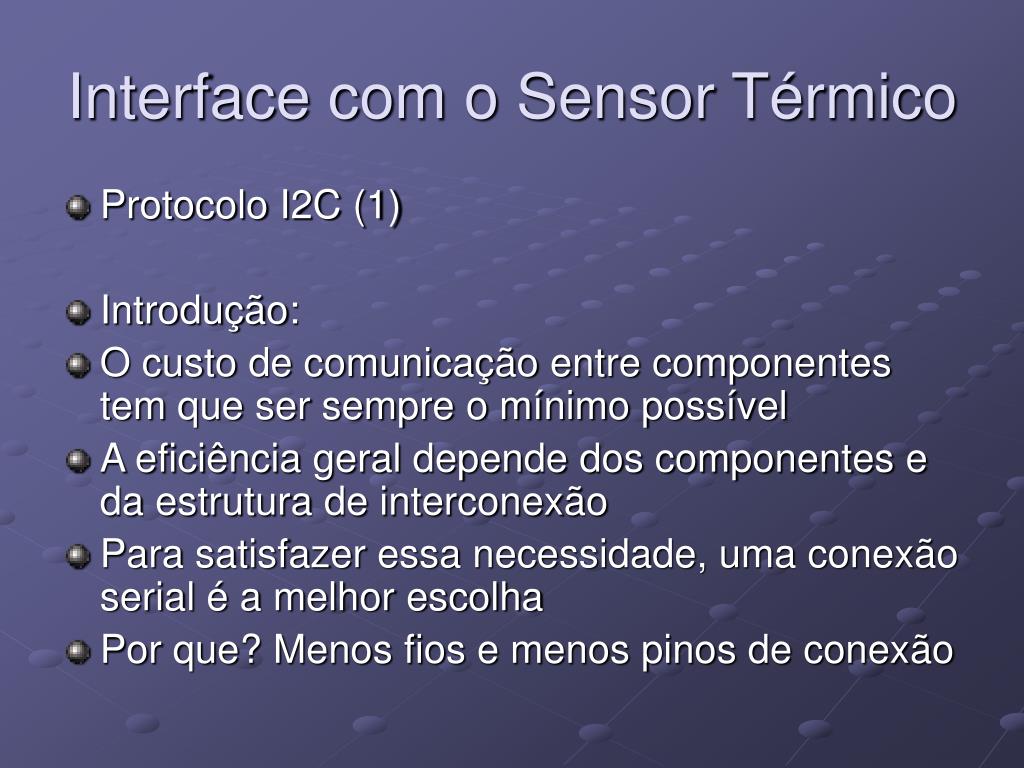 Interface com o Sensor Térmico • Protocolo I2C (1) • Introdução: • O custo de comunicação entre componentes tem que ser sempre o mínimo possível • A eficiência geral depende dos componentes e da estrutura de interconexão • Para satisfazer essa necessidade, uma conexão serial é a melhor escolha • Por que? Menos fios e menos pinos de conexão