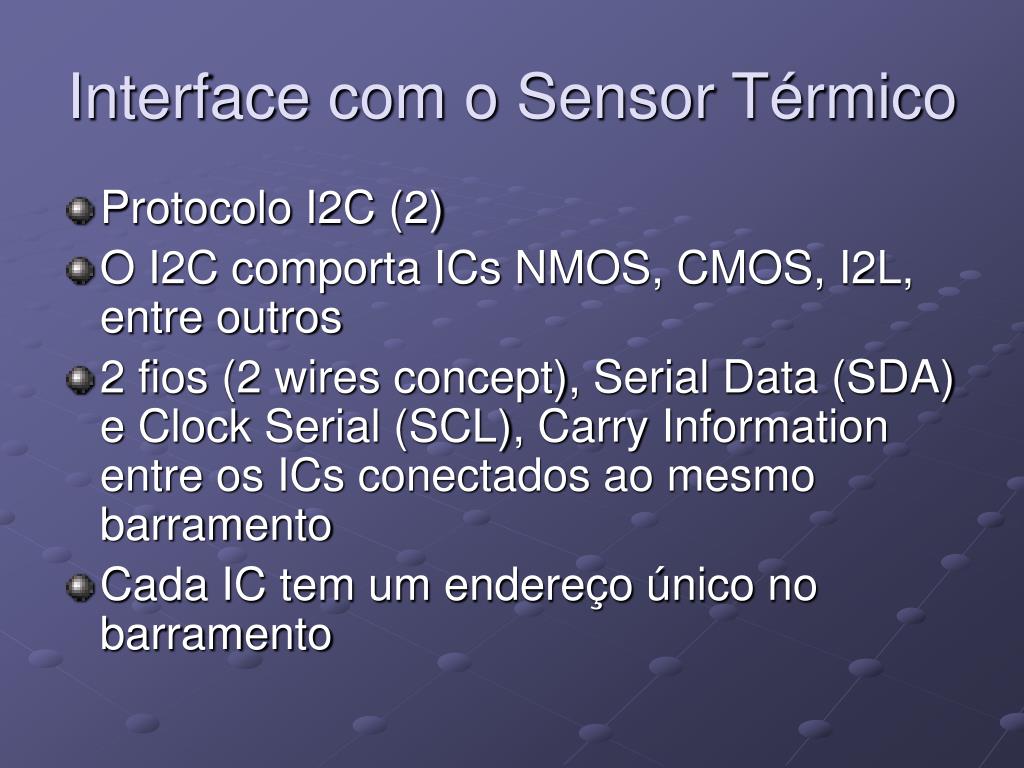 Interface com o Sensor Térmico • Protocolo I2C (2) • O I2C comporta ICs NMOS, CMOS, I2L, entre outros • 2 fios (2 wires concept), Serial Data (SDA) e Clock Serial (SCL), Carry Information entre os ICs conectados ao mesmo barramento • Cada IC tem um endereço único no barramento