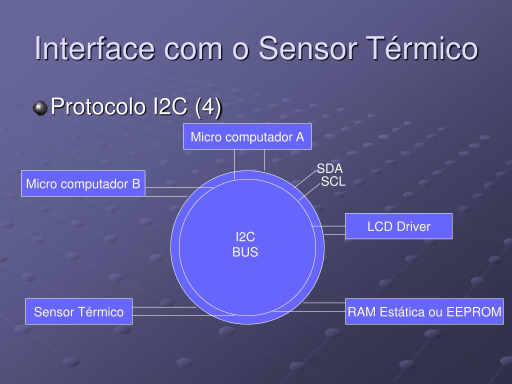 Interface com o Sensor Térmico • Protocolo I2C (4) Micro computador A SDA Micro computador B SCL LCD Driver I2C BUS Sensor Térmico RAM Estática ou EEPROM
