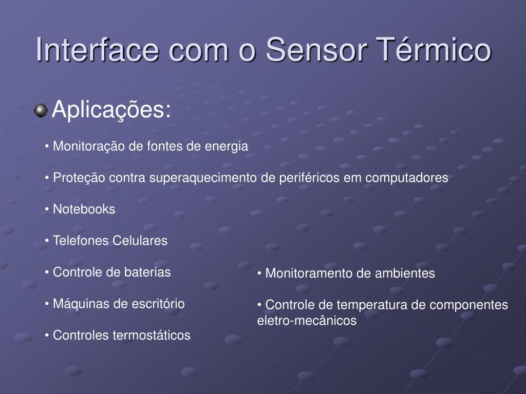 Interface com o Sensor Térmico • Aplicações: • Monitoração de fontes de energia • Proteção contra superaquecimento de periféricos em computadores • Notebooks • Telefones Celulares • Controle de baterias • Máquinas de escritório • Controles termostáticos • Monitoramento de ambientes • Controle de temperatura de componentes • eletro-mecânicos