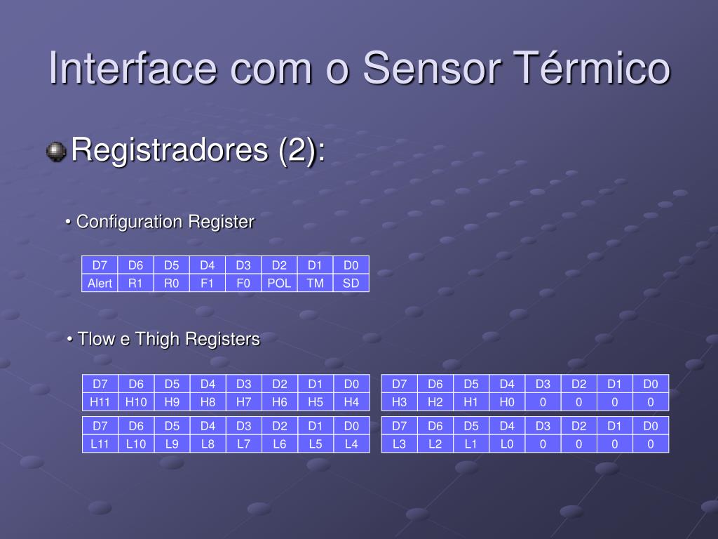 D7 D7 D6 D6 D5 D5 D4 D4 D3 D3 D2 D2 D1 D1 D0 D0 D7 D7 D6 D6 D5 D5 D4 D4 D3 D3 D2 D2 D1 D1 D0 D0 L11 H11 H10 L10 L9 H9 L8 H8 L7 H7 H6 L6 H5 L5 H4 L4 L3 H3 L2 H2 H1 L1 H0 L0 0 0 0 0 0 0 0 0 D7 D6 D5 D4 D3 D2 D1 D0 Alert R1 R0 F1 F0 POL TM SD Interface com o Sensor Térmico • Registradores (2): • Configuration Register • Tlow e Thigh Registers