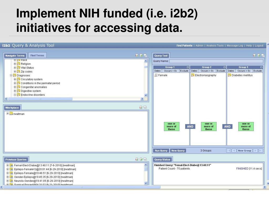 Implement NIH funded (i.e. i2b2) initiatives for accessing data.