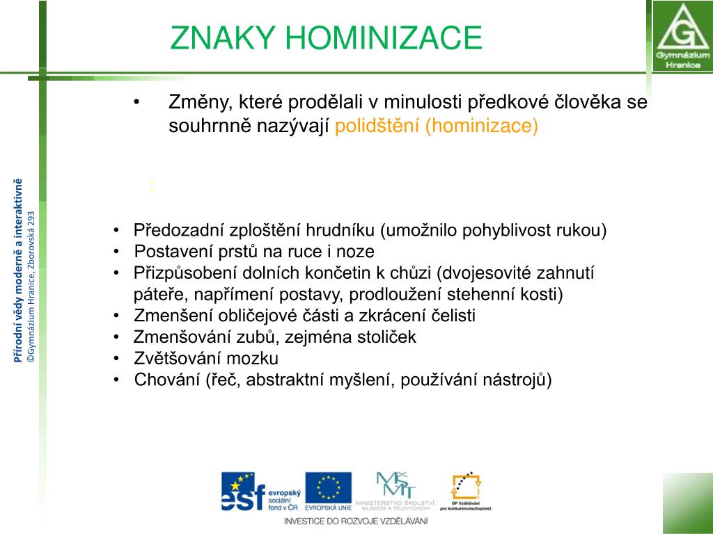 ZNAKY HOMINIZACE • Změny, které prodělali v minulosti předkové člověka se souhrnně nazývají polidštění (hominizace) • : • Předozadní zploštění hrudníku (umožnilo pohyblivost rukou) • Postavení prstů na ruce i noze • Přizpůsobení dolních končetin k chůzi (dvojesovité zahnutí páteře, napřímení postavy, prodloužení stehenní kosti) • Zmenšení obličejové části a zkrácení čelisti • Zmenšování zubů, zejména stoliček • Zvětšování mozku • Chování (řeč, abstraktní myšlení, používání nástrojů)