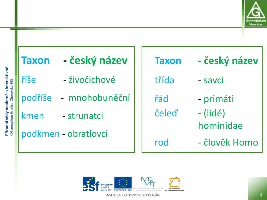 Taxon - český název říše - živočichové podříše - mnohobuněční kmen - strunatci podkmen - obratlovci Taxon- český název třída - savci řád - primáti čeleď - (lidé) hominidae rod - člověk Homo