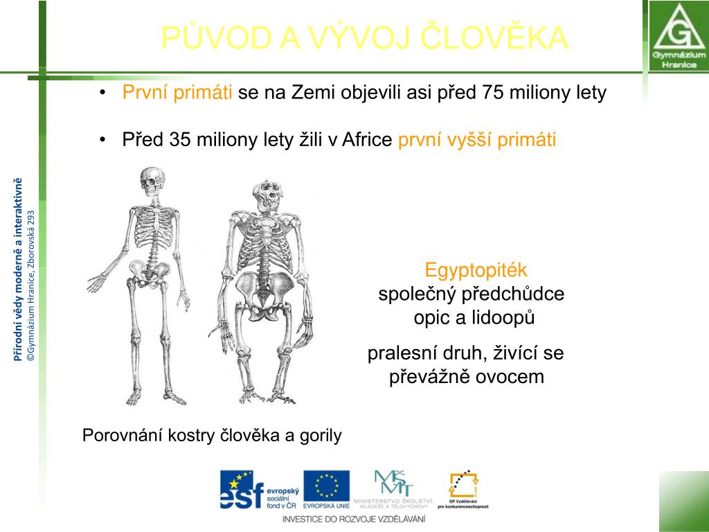 PŮVOD A VÝVOJ ČLOVĚKA • První primáti se na Zemi objevili asi před 75 miliony lety • Před 35 miliony lety žili v Africe první vyšší primáti • Egyptopiték • společný předchůdce • opic a lidoopů • pralesní druh, živící se • převážně ovocem Porovnání kostry člověka a gorily