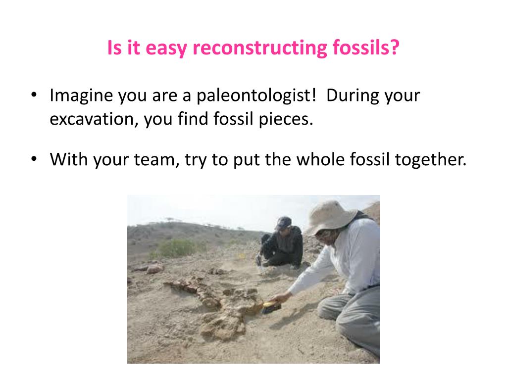 Is it easy reconstructing fossils? • Imagine you are a paleontologist! During your excavation, you find fossil pieces. • With your team, try to put the whole fossil together.