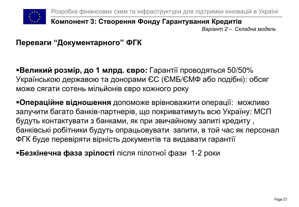 Компонент 3: Створення Фонду Гарантування Кредитів Варіант2 – Складна модель Переваги “Документарного” ФГК • Великий розмір, до 1 млрд. євро: Гарантії проводяться 50/50% Українською державою та донорами ЄС (ЄМБ/ЄМФабо подібні): обсяг може сягати сотень мільйонів євро кожного року • Операційне відношення допоможе врівноважити операції: можливо залучити багато банків-партнерів, що покриватимуть всю Україну: МСПбудуть контактувати з банками, як при звичайному запиті кредиту , банківські робітники будуть опрацьовувати запити, в той час як персонал ФГК буде перевіряти вірність документів та видавати гарантії • Безкінечна фаза зрілостіпісля пілотної фази 1-2 роки